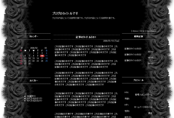 /*****全ブロックの共通設定*****//*HTML全体に関する設定*/html{scrollbar-arrow-color: #333;scrollbar-base-color: #333;scrollbar-face-color: #fff;scrollbar-highlight-color: #fff;scrollbar-3d-light-color: #333;scrollbar-shadow-color: #333;scrollbar-track-color: #fff;scrollbar-darkshadow-color: #fff;}/*BODY全体に関する設定*/body { text-align:center; font-size:12px; margin:auto; color:#fff; padding: 0px; font-family:"MS UI Gothic","Osaka","sans-serif"; background-image:url('http://blog.cnobi.jp/v1/blog/user/b95ef955d8ebb283417eed0e2abb5e02/1169857602'); background-position: center; background-repeat: repeat-y; }.EntryTextBox img{}/*の全ての設定*/td { text-align:center; font-size:12px;}/*table全ての設定*/table{ border-collapse: collapse;}/*通常のリンクの設定*/a:link { color:#fff; text-decoration:none; }/*過去に見たことがあるページのリンクの設定*/a:visited{ color:#fff; text-decoration:none; }/*カーソルが合っている状態のリンクの設定*/a:hover { color:#B22222; text-decoration:none; }/*アクティブ状態のリンクの設定*/a:active { color:#fff; text-decoration:line-through; }.emoji { vertical-align:middle;}/*レイアウト全体の設定*/#LayoutBlock { width:805px; text-align: center; margin:auto; padding:0px; text-align:center;}/*テキスト左寄せ*/.left { text-align:left;}/*テキスト中央寄せ*/.center { text-align:center;}/*テキスト右寄せ*/.right { text-align:right;}input,textarea{ border:solid 1px #ccc; background-color:#000;}/******トップブロック用デザイン******//*一番上のブロック(タイトルが書かれる場所)の設定*/#TopBlock { width:100%; height:200px; text-align:left; margin: 0px;}/*ページタイトル文字部分の設定*/#TopTitle { padding: 100px 0px 0px 200px; font-size:18px; font-weight:bold;}#TopTitle a:link { text-decoration:none; }#TopTitle a:visited{ text-decoration:none; }#TopTitle a:hover { color:#B22222; text-decoration:none; }#TopTitle a:active { text-decoration:none; }/*ページタイトルの下に来るブログの説明文書*/#TopExplanation { padding: 10px 0px 0px 200px; color:#ccc; text-align: left;}/*コメント管理、編集等の部分*/#AdminBlock{ text-align: right; padding: 5px;}#AdminBlock a:link { text-decoration:none; color:#ccc;}#AdminBlock a:visited{ text-decoration:none; color:#ccc;}#AdminBlock a:active { text-decoration:line-through; color:#B22222;}#AdminBlock a:hover { text-decoration:none; color:#B22222;}/******フッターブロック用デザイン******//*一番下のブロック(著作権表示が書かれる場所)の設定*/#FooterBlock { width : 100%; height:100px; clear:both; text-align: center; padding:10px 0px 0px 0px;}/*フッター部分のリンク設定*/#FooterBlock a:link { text-decoration:none;}#FooterBlock a:visited{ text-decoration:none;}#FooterBlock a:hover { text-decoration:underline;}#FooterBlock a:active { text-decoration:line-through;}/******左メニューデザイン******/#LeftBlock{ float: left; width: 190px; margin: 0px 0px;}/******右メニューデザイン******/#RightBlock{ float: right; width: 190px; margin: 0px px;}/******プラグインブロック用デザイン******//*プラグイン表示箇所全体の設定*/.Plugin { text-align: left;}.Plugin a:link { text-decoration:none;}.Plugin a:visited{ text-decoration:none;}.Plugin a:active { text-decoration:underline;}.Plugin a:hover { text-decoration:none;}/*プラグイン表示箇所の背景や余白設定*/.PluginInner { margin: 0px 0px 20px 0px; padding: 0px;}/*プラグインのタイトル(名称)部分の設定*/.PluginTitle {border-top:dotted 2px #ccc;border-bottom:dotted 2px #ccc; text-align: center; font-weight:bold; font-size:12x; padding:10px; margin:1px 0px 1px 0px;}/*プラグインの説明部分の設定*/.PluginExplanation { padding: 15px; margin: 0px;}/*プラグインが表示される場所の設定*/.pluginContents { padding: 10px; font-size:12px; text-align: center;}.PluginFooter{ height:1px;}/******各プラグイン共通項目用設定******//*各プラグイン処理内の基本デザイン*/.plugin_data { text-align:left; padding:5px; font-size: 12px;}/*各プラグイン処理内基本デザインの下に記載する日付など*/.plugin_data_date { text-align:right; font-size: 10px;}/******記事ブロック用デザイン******//*記事繰り返し処理全ての部分の設定*/#EntryBlock { width:405px; float: left; text-align: left; margin: 0px 5px;}/*記事表示部分の背景や余白等の設定*/.EntryInner { padding: 10px; text-align: left; border:solid 0px #ccc; margin: 0px 0px 25px 0px;}/*各記事タイトル部分の設定*/.EntryTitle { text-align: center; border-top: dashed 1px #ccc; border-bottom: dashed 1px #ccc; font-size:14px; color:#fff; font-weight:bold; padding:5px 10px 5px 10px;}/*各記事やコメント、トラックバックなどの総合のブロック部分*/.EntryTextBox { margin:5px 0px;}/*記事本文が記載される部分*/.EntryText { padding: 10px; padding-bottom:10px; line-height:140%;}/*引用部分*/blockquote{ border:dashed 1px #999; color:#ccc; padding:10px;}/*追記文書が記載される部分*/.EntryPsText { padding: 10px; text-align: right;}/*記事へのリンク(コメントやトラックバック等)の背景*/.EntryFooter { text-align:right; padding:5px;}/*記事の投稿者名が記載されている部分*/.EntryUserName {}/*記事を投稿した日が記載されている部分の背景*/.EntryDate { text-align: right; padding:2px;}/*記事を投稿した日が記載されている部分*/.EntryWriteDate { margin-left: 5px;}/*記事のカテゴリ名が記載されている部分*/.EntryCategory { margin-left: 5px;}/*記事へのコメントリンクが記載されている部分*/.EntryComment { margin-left: 5px;}/*記事へのトラックバックリンクが記載されている部分*/.EntryTrackback { margin-left: 5px;}/*次の記事やHOME